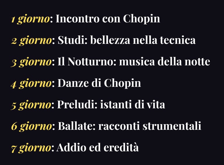 Il corso "7 giorni con Chopin" nasce dall’esperienza e dalla passione per la musica di Chopin, maturate attraverso anni di studio, ascolto e approfondimento.